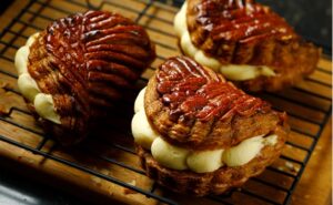 ショソン・エシレは、何層にも重なったフィユタージュ(パイ生地)の間に、たっぷりのバタークリームが挟まれています。