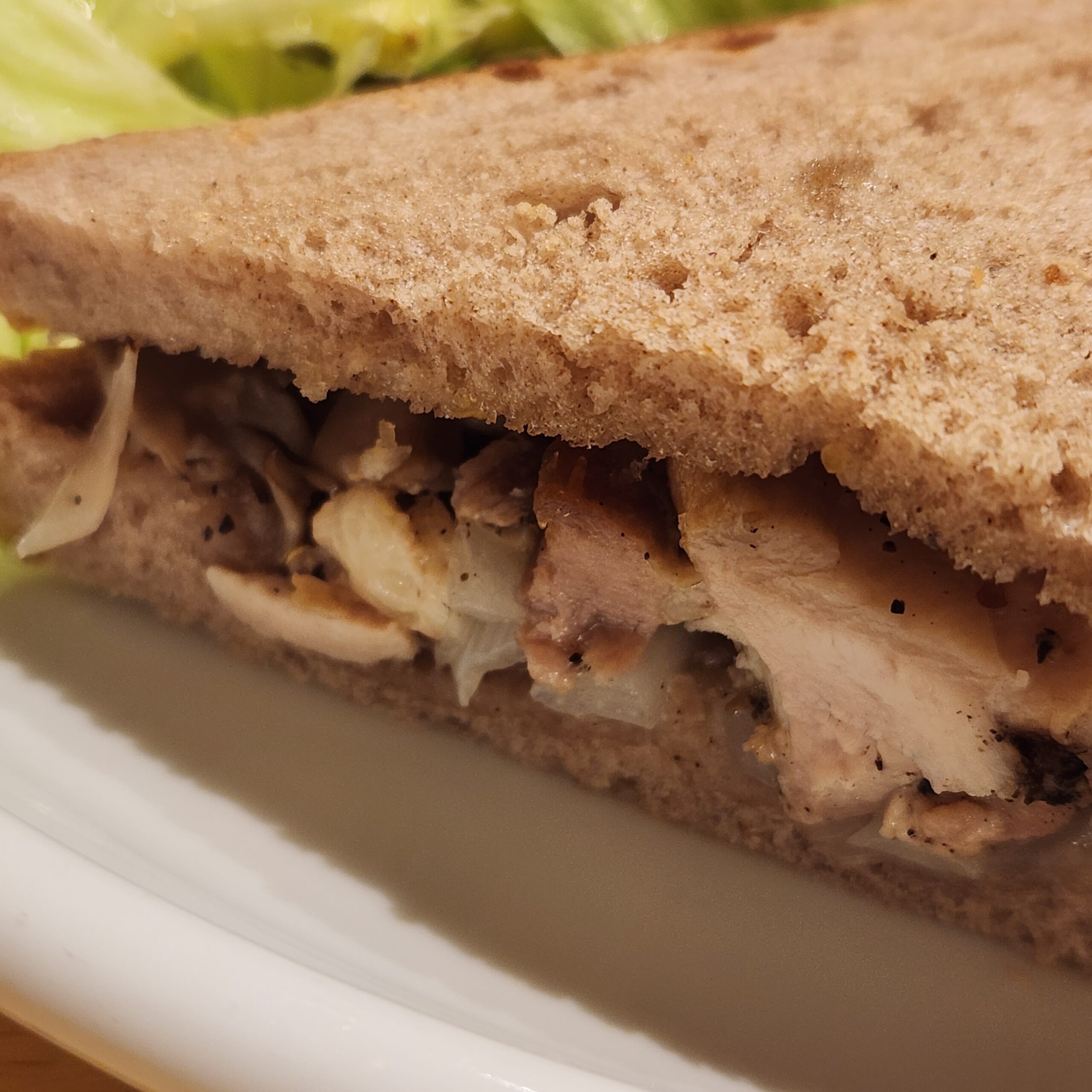 まいたけと鶏肉がたっぷり挟まっていて、香ばしい全粒粉の風味がたまりません。パンはしっとりとしていて、具材との一体感が素晴らしい。
